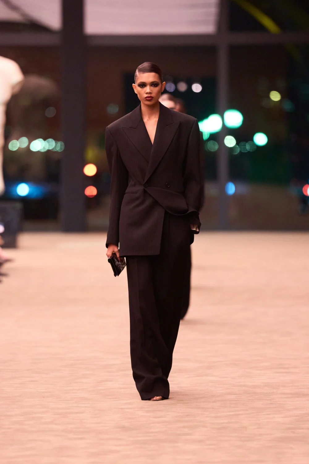 Vaccarello’s approach to the modern tuxedo was characterized by a masterful understanding of fluidity and form. He revealed backstage that he had drawn inspiration from the sloping shoulder lines of his recent men’s tailoring, adapting them to create garments that were both structured and sensually unlined for the female form. This meticulous attention to detail extended beyond the garments themselves, influencing the entire presentation. The models’ hair was uniformly styled with a severe side part, slicked back into a tight bun, a look that perfectly complemented the makeup artistry by Pat McGrath. McGrath’s interpretation featured a signature smoky eyeshadow, sharp cheekbone contouring, and a deep, glossy dark red lip, an accurate evocation of the iconic Saint Laurent makeup as immortalized in Helmut Newton’s photography and the brand’s advertising campaigns of the 1970s and 1980s. This cohesive vision created a powerful, almost historical, resonance, transporting the audience back to an era of daring self-expression and undeniable allure.