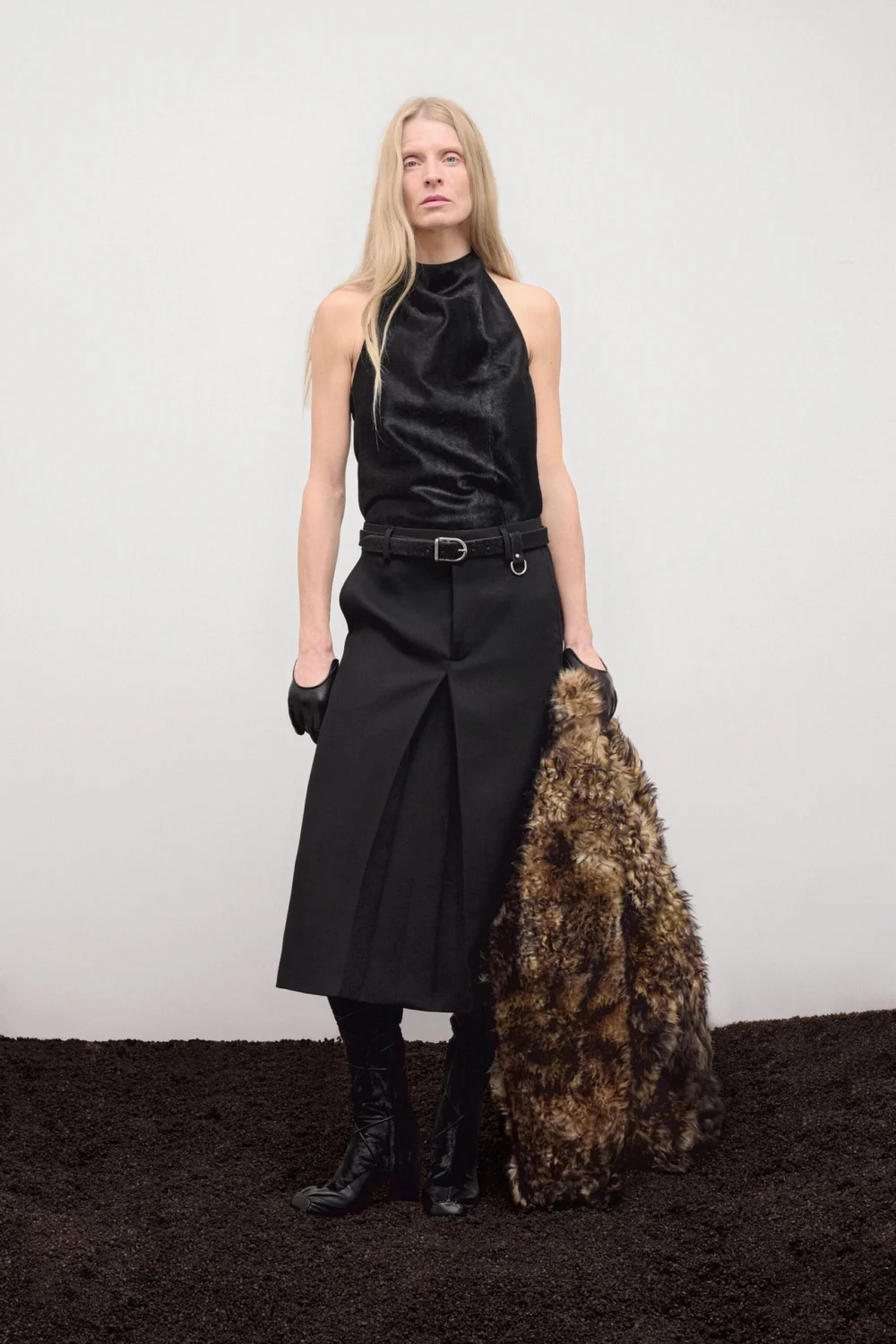 The introduction of eveningwear marks a significant expansion for Durazzi, but true to her ethos, it bypasses the ostentatious and embraces a more nuanced form of elegance. The tuxedo with ponyskin lapels, paired with a chiffon kilt, is a prime example of this approach. It subverts traditional eveningwear expectations with unexpected material choices and silhouette pairings, creating a look that is both sophisticated and subtly rebellious. The draped halter-neck dress further illustrates this point, its fluidity and understated silhouette emphasizing natural form and graceful movement. This is not eveningwear designed for the spotlight of a red carpet; it is clothing for the discerning individual who appreciates understated luxury and a quiet confidence. The "no-logo" philosophy is central here, signaling a departure from overt brand signaling and a return to the intrinsic value of well-designed, beautifully crafted garments. Durazzi’s language in fashion is akin to that of an artist speaking to a cultivated audience; it is direct, meaningful, and resonates on a deeper level, creating clothing that is both essential and undeniably present.