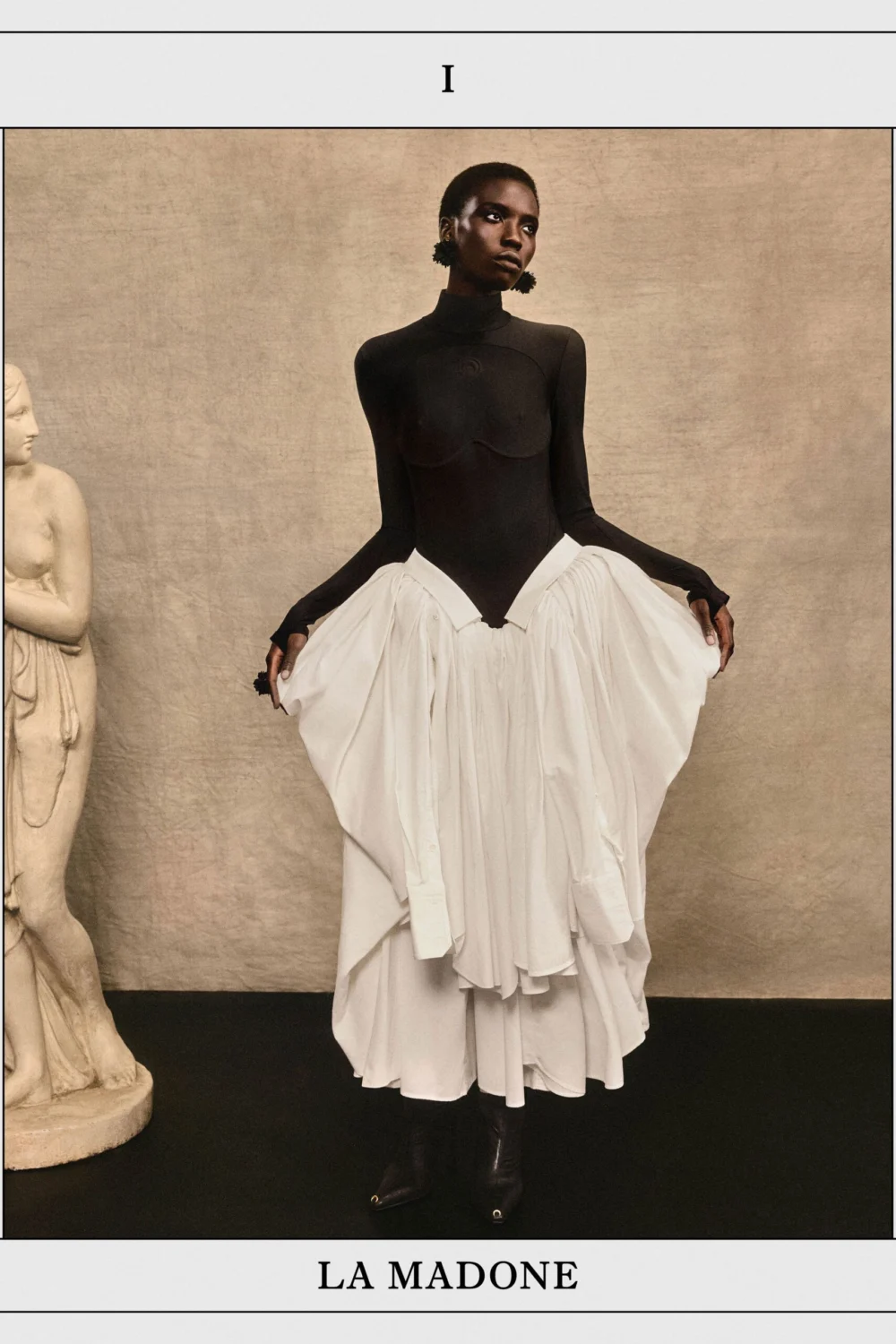 The lookbook is further enriched with imagery of fruits, flowers, and even domestic animals, evoking the still-life tradition and the domesticity often depicted in classical art. Amidst these artistic flourishes, the wardrobe offerings are abundant. A leather ensemble showcases embossed moons, a nod to Serre’s signature motif, complemented by a faux fur "shawl" that elegantly drapes over the shoulders. A denim jacket is reimagined with historical sleeves and corset seams, blending classic tailoring with modern denim. Artful tapestries are paneled into denim pieces, with each iteration offering unique variations, emphasizing the individuality of handcrafted elements. Serre’s signature jersey fabric is ingeniously repurposed into pompom cuffs on a little black dress, which features sheer incrustations, a design dubbed "La Bourgeoise."