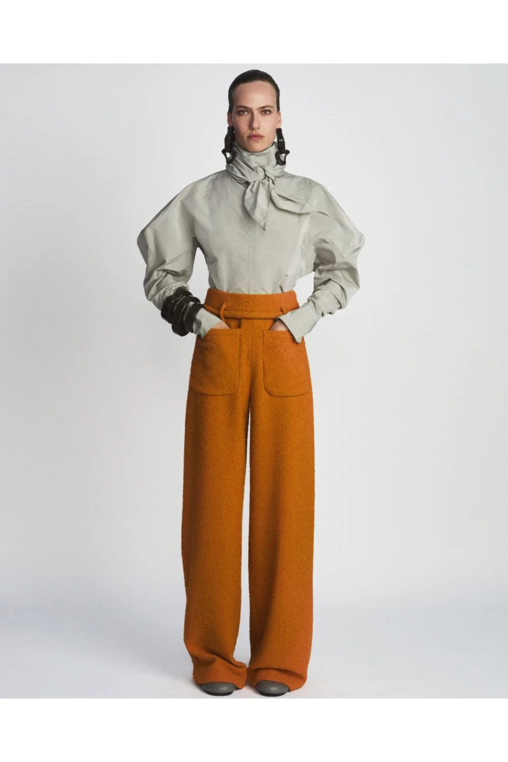 Leroy’s Autumn/Winter collection is built upon a foundation of two seemingly disparate yet complementary materials: a Japanese silk-polyester taffeta and a robust, felted wool. The color palette for this season draws inspiration from the "wartime ’40s" era, featuring a sophisticated array of dove gray, prune, and black. These muted tones are strategically punctuated by vibrant accents of red and orange, injecting a contemporary dynamism into the collection.